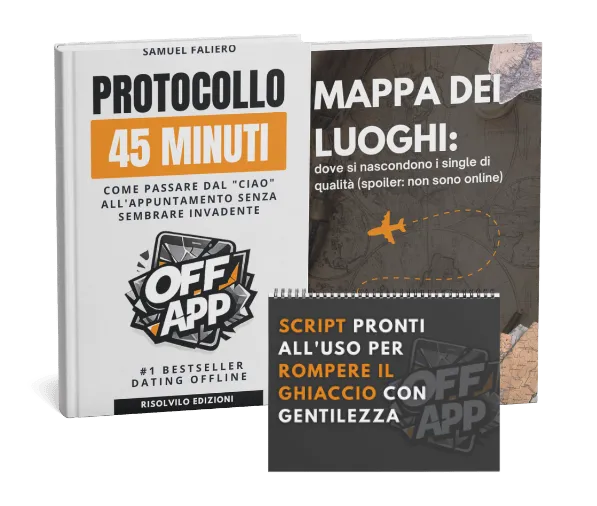 OFF-APP è la tua via d'uscita. Mentre gli altri si combattono per un grammo di attenzione digitale, tu imparerai il Protocollo di OFF-APP: un metodo scientifico per tornare a connetterti con persone reali, in luoghi reali, eliminando per sempre l'ansia da rifiuto e il fantasma del ghosting.
